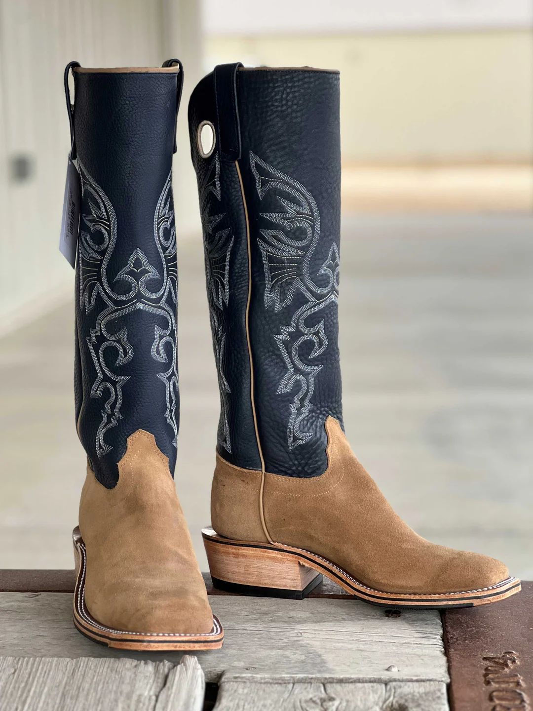 This Outpost Exclusive Olathe Boot is a boot built for hard work. Navy Bulldozer is a thick but very soft leather that is a premium top leather. The Tan Newman Roughout vamps are a classic look and combine comfort, durability and low maintenance. If durability and comfort perk your ears up then you're going to love the flexible, long lasting hyrid soles on this bad boy!