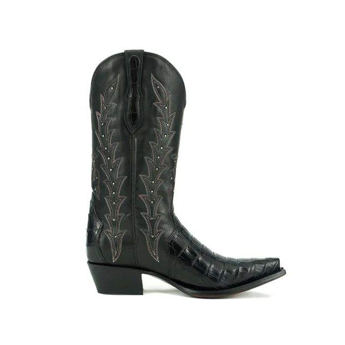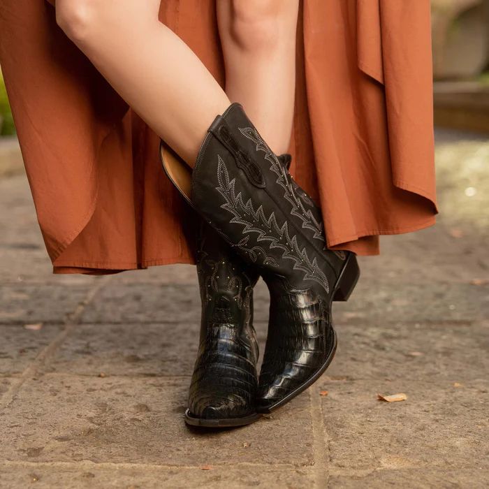 This little lady will be the center of attention. A gorgeous Caiman tail vamp is topped off with a stitched twelve inch calfskin shaft and highlighted with decorative studding. KELLI kicks things off with a snip toe in Midnight black or Chocolate brown choices. Every step is a statement!