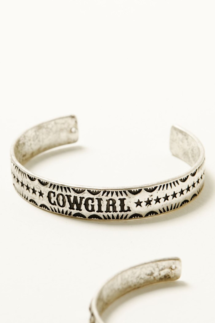 - Bracelet 1: Silver-toned cuff with "Cowgirl" painted details