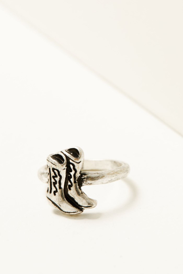 - Ring 2: Silver-toned band with cowboy boots pendant and painted details