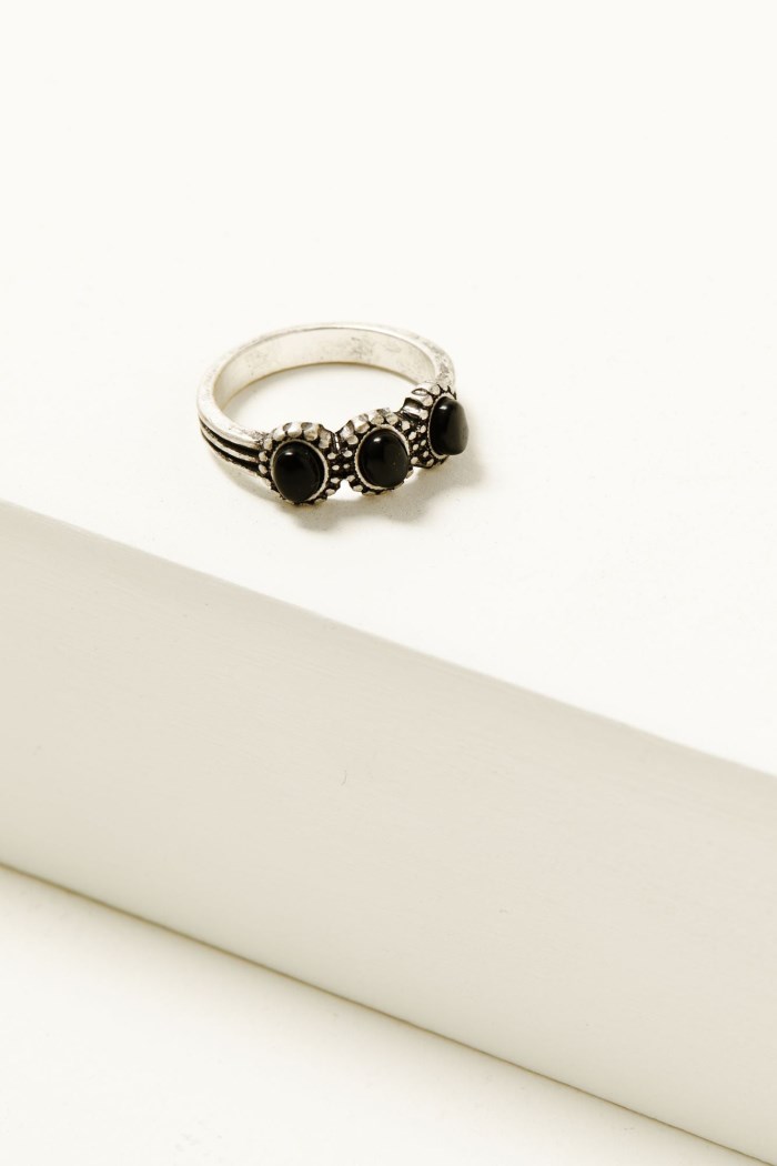 - Ring 1: Silver-toned band with black stone accents and painted details