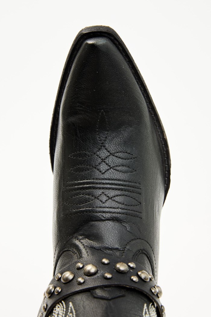 - Solid black design with white western stitching