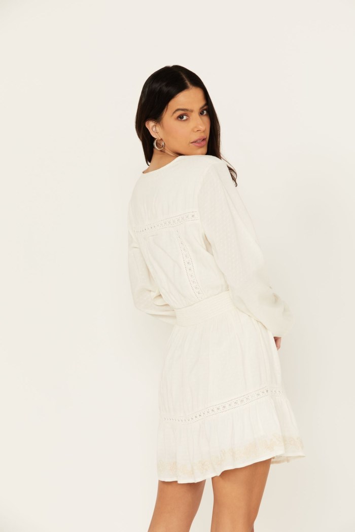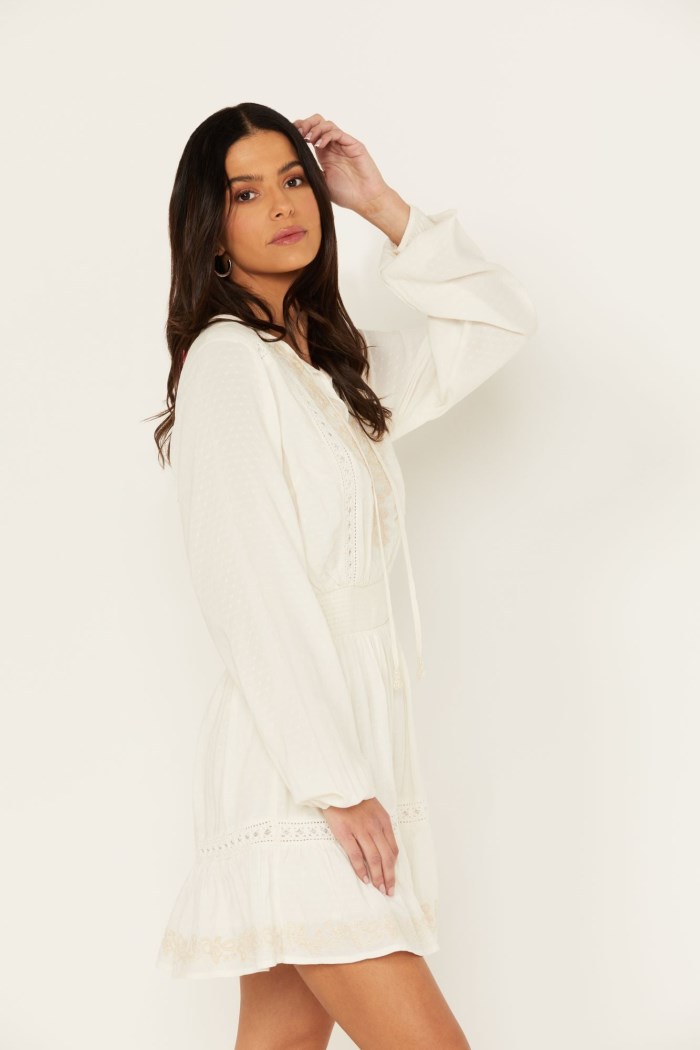 - Lace inset panels on bodice and skirt with embroidered accents
