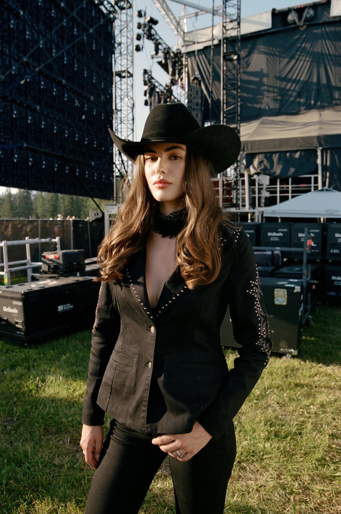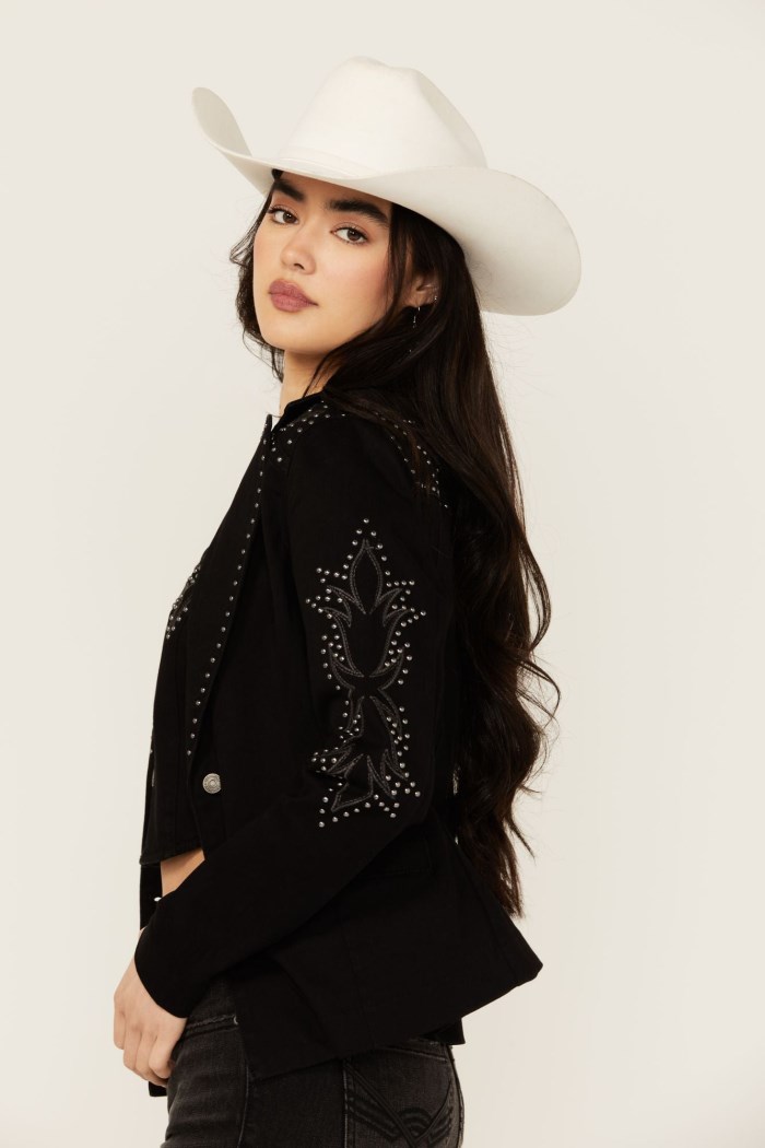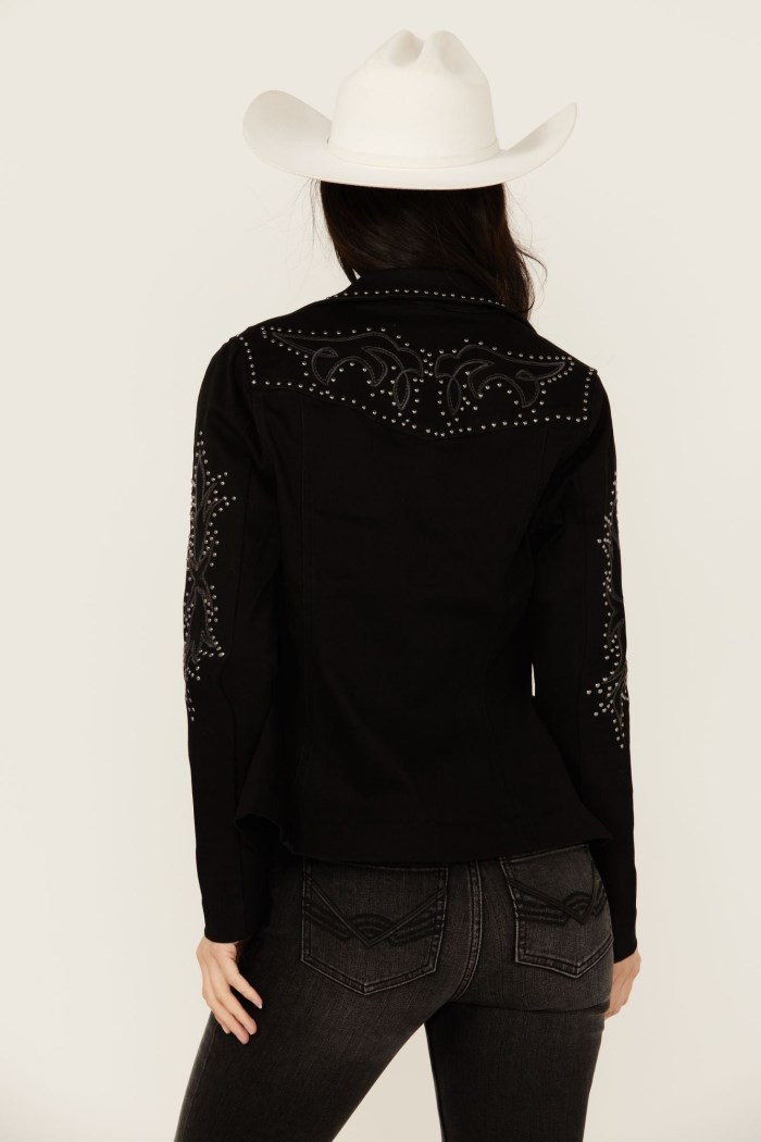 - Silver-toned studded accents on collar, yokes, and sleeves