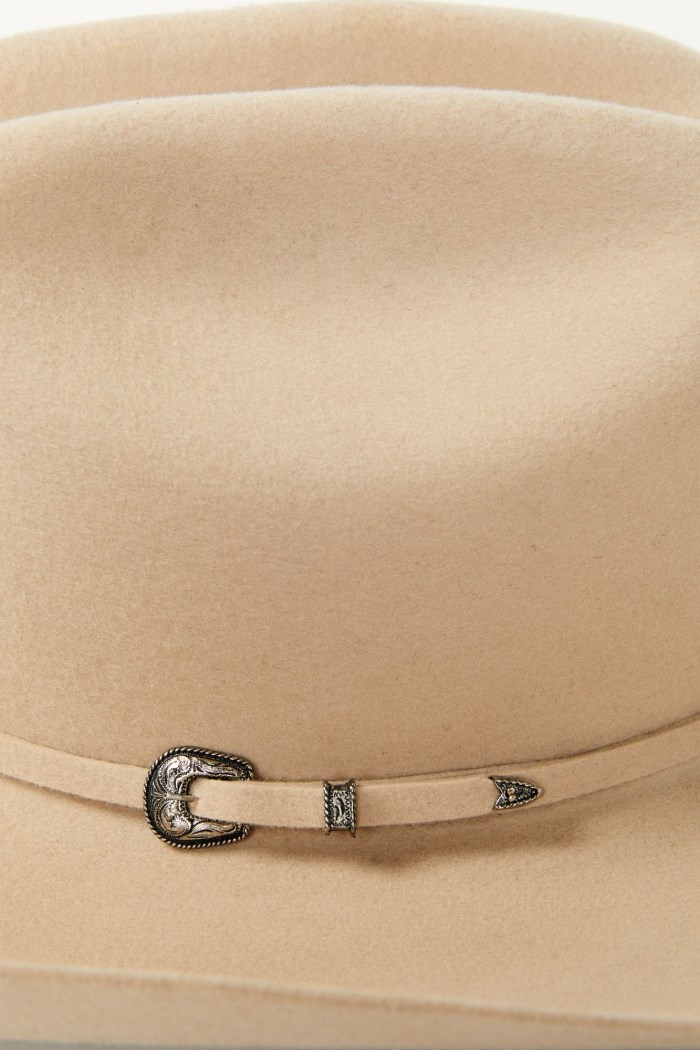 - Silver-toned buckle set with painted details on hat band
