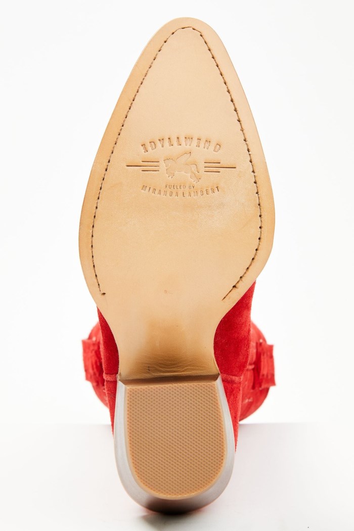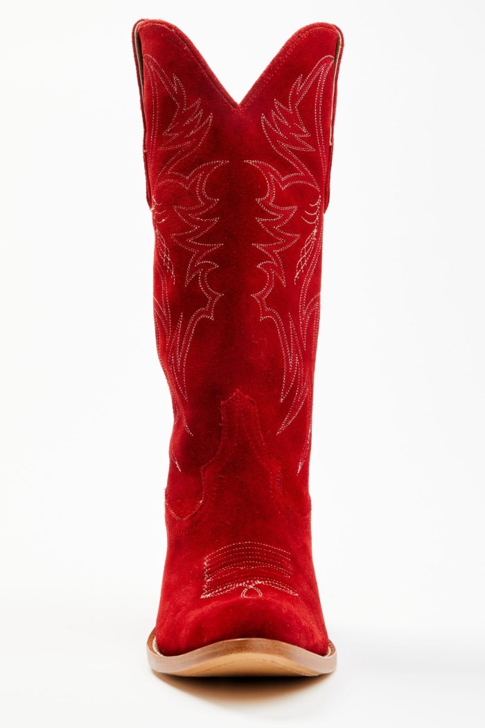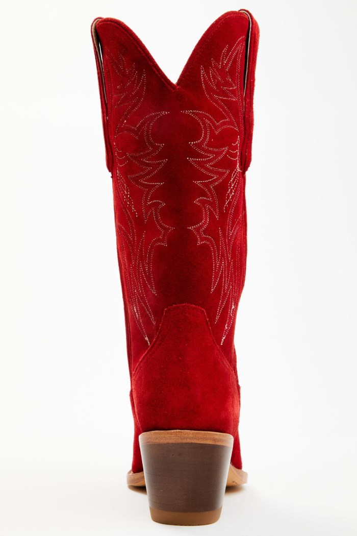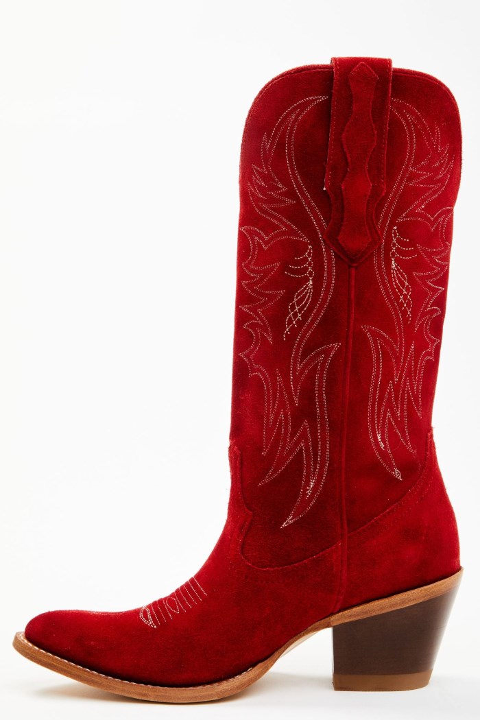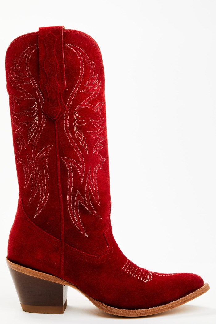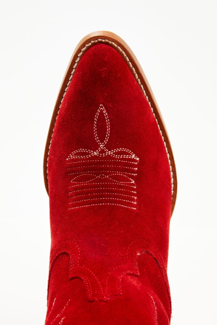 - Solid red design with western stitching