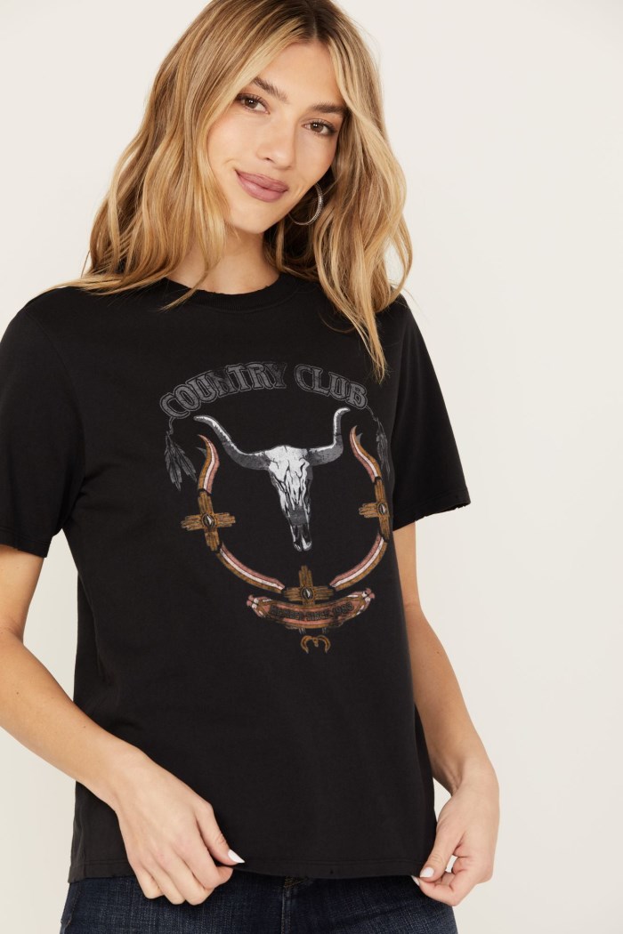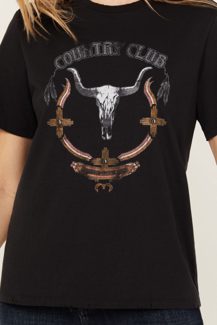 - "Country Club" with steerhead skull, feathers, and Native American necklace graphic on front