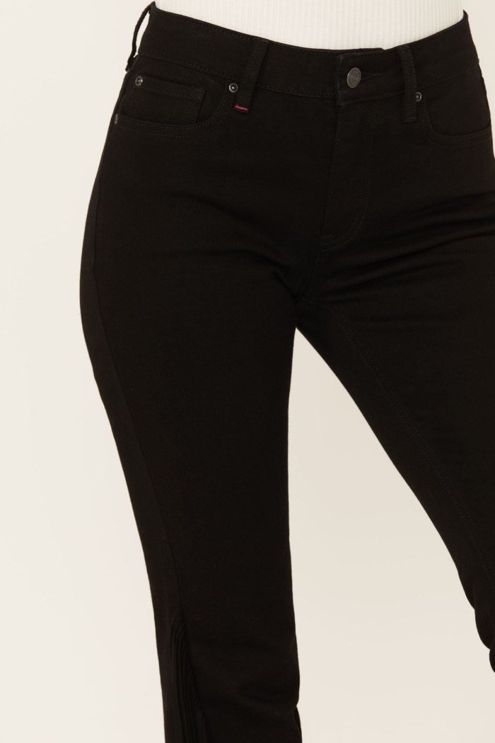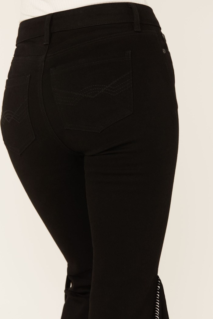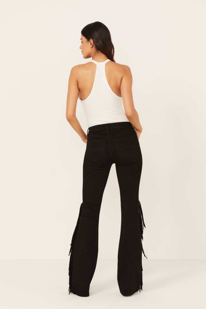 - Bootcut leg with finished hems and fringe accents on sides