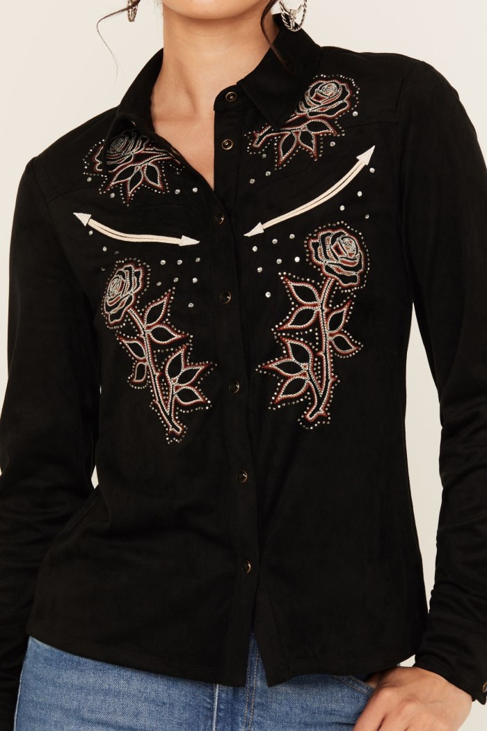 - Floral embroidery and rhinestone accents throughout