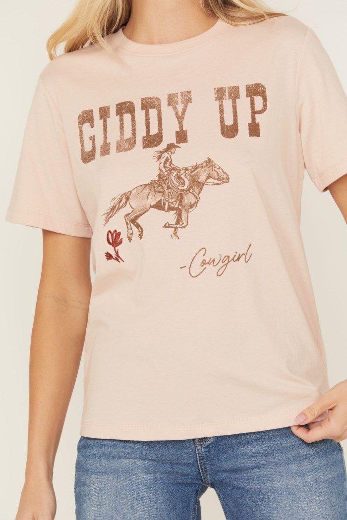 - "Giddy Up Cowgirl" graphic print and floral embroidery on front
