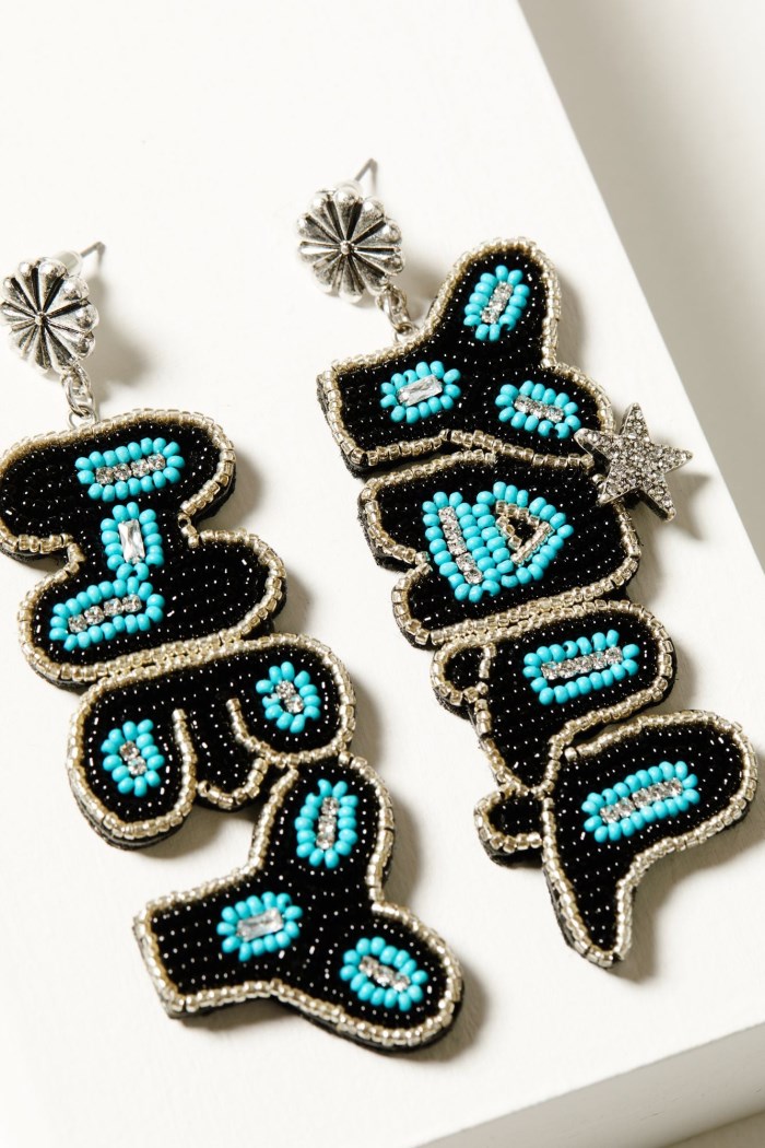 - Silver-toned stud earring with "Hey" and "Y'all" beaded designs