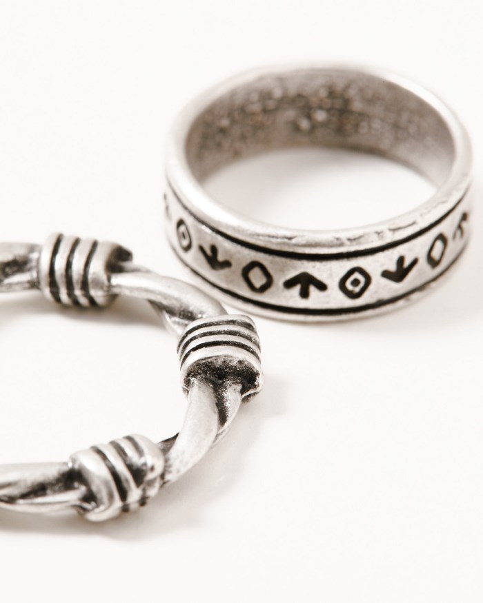 - Ring 2: Silver-toned band with barbed wire design and painted details