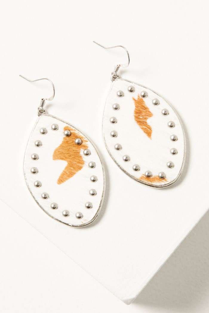 - Oval brown and white hair-on design with silver studding and silver-toned border