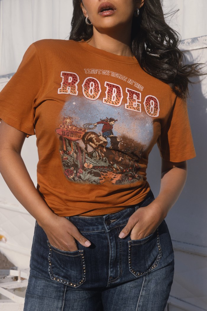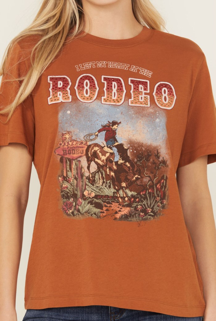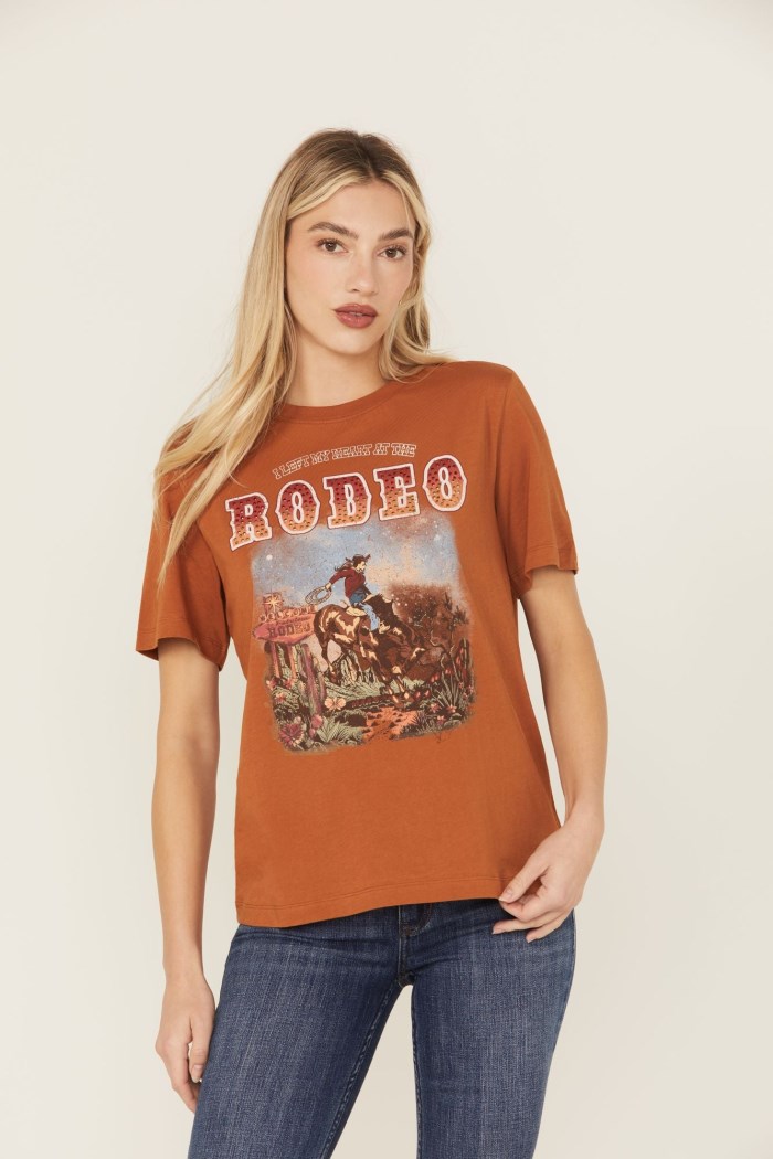 - "I Left My Heart At The Rodeo" cowgirl graphic print on front
