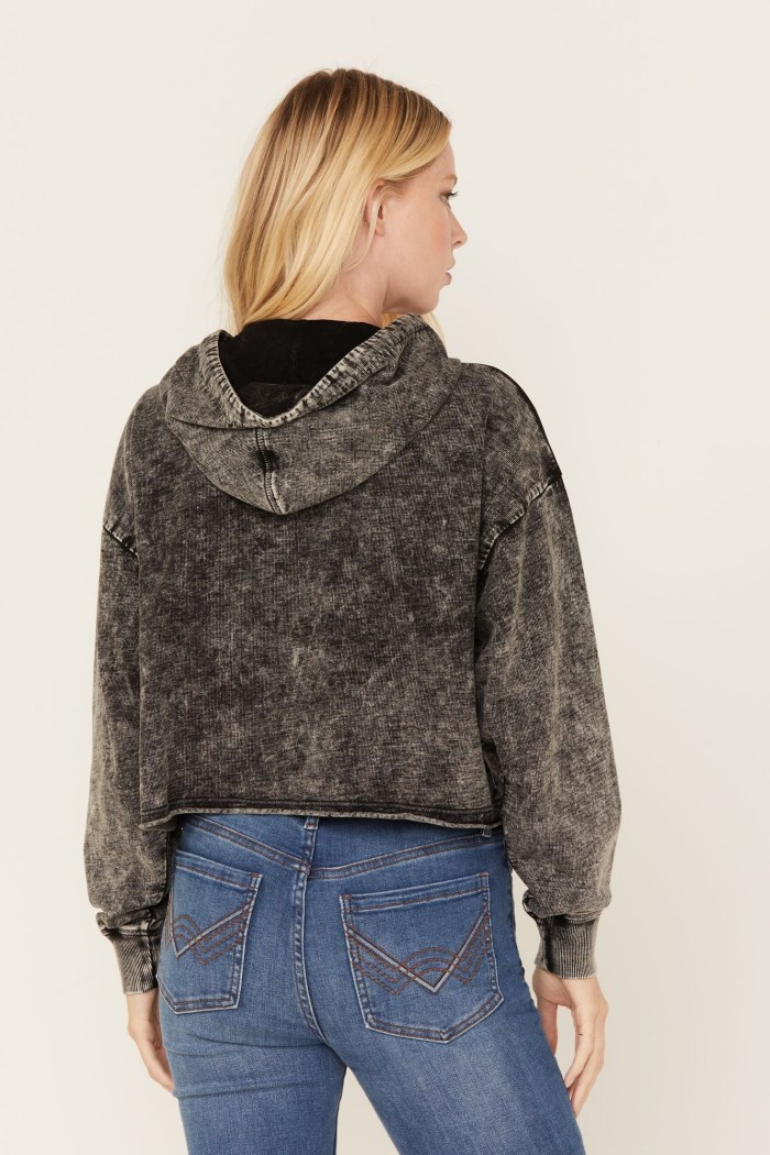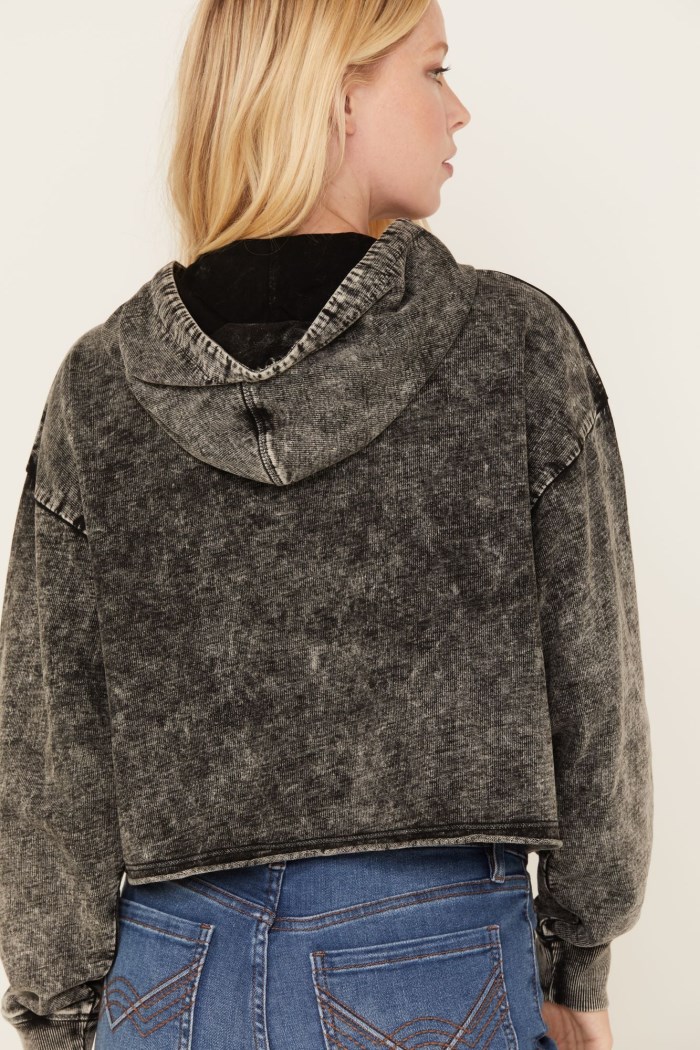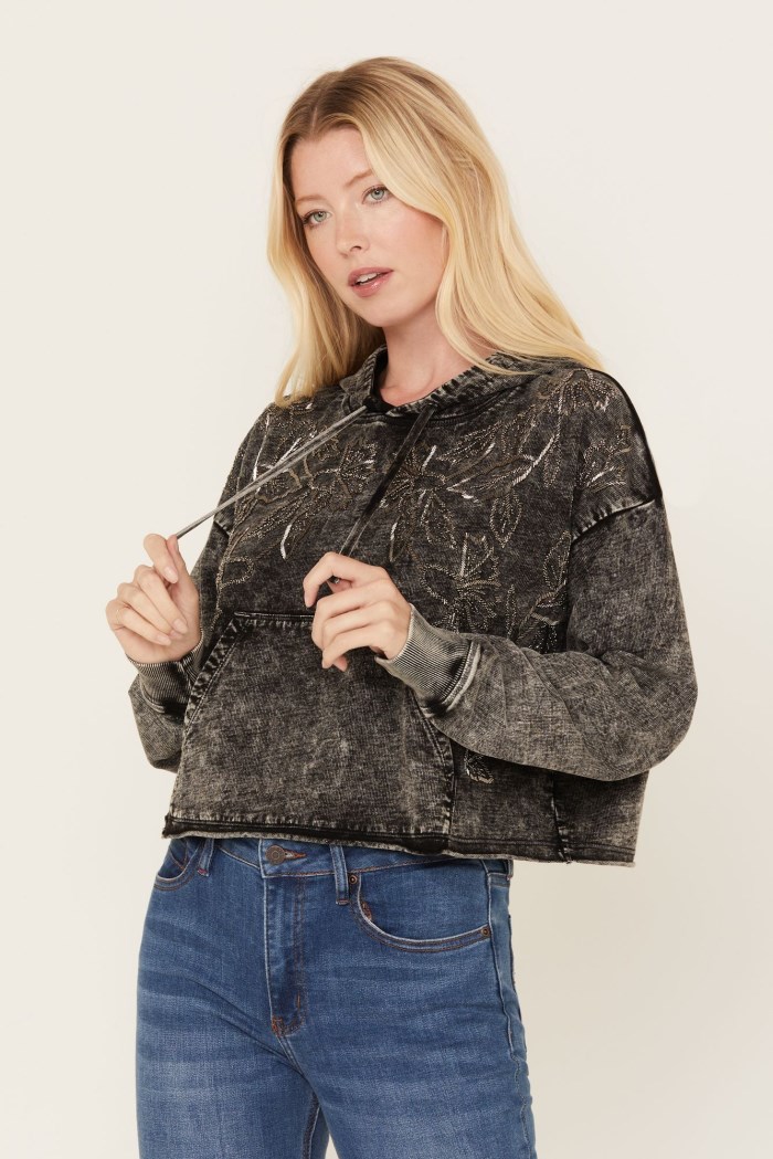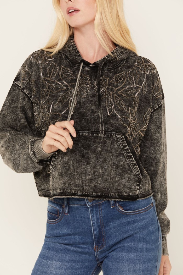 - Acid wash charcoal with silver floral embroidered design on upper