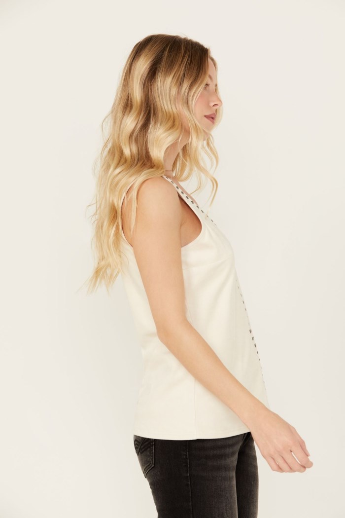 - Silver-toned studded accents on front