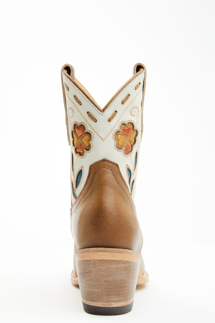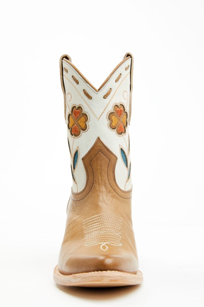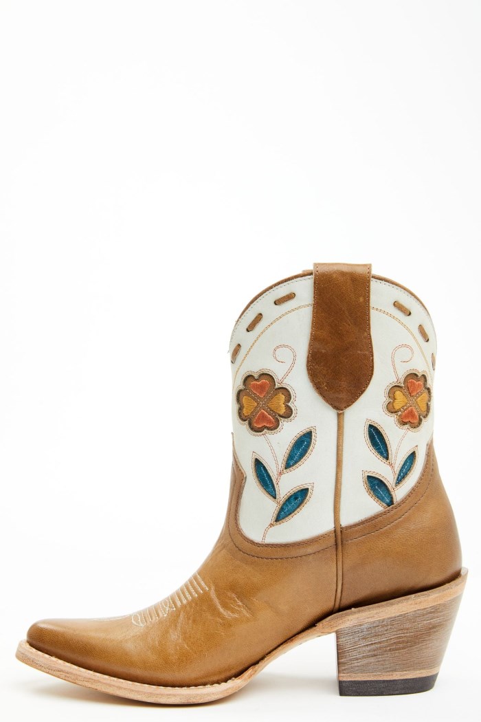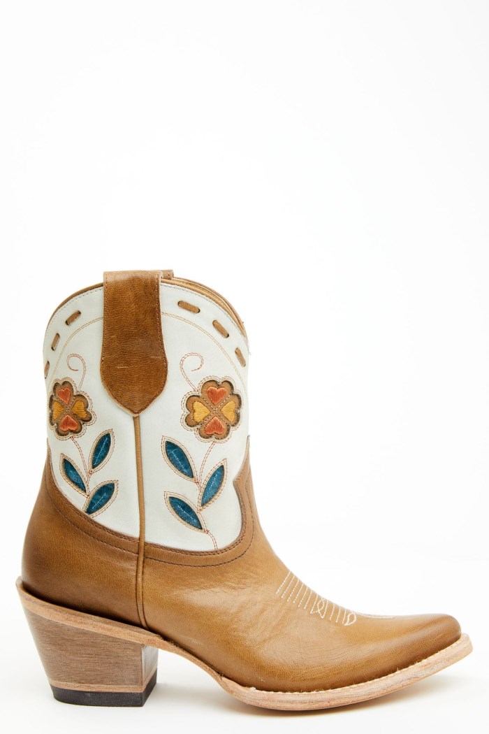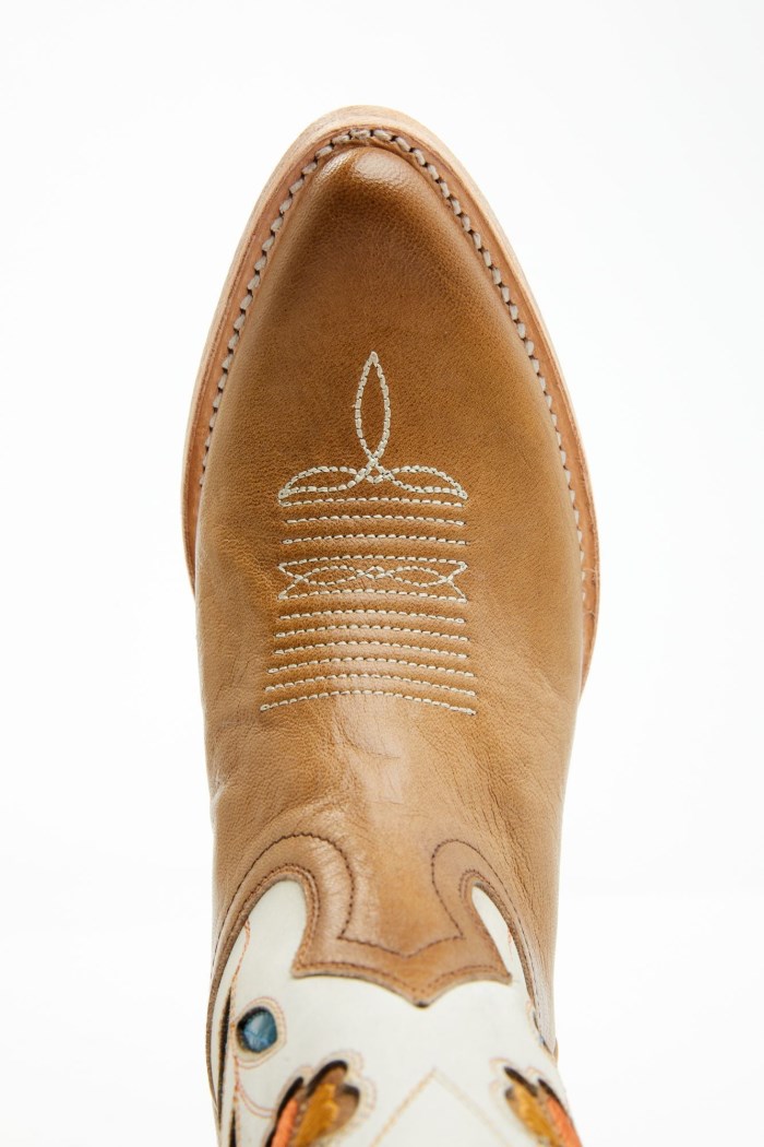 - Tan vamp and ivory shaft with multicolored floral inlay design and tan buck stitch accents