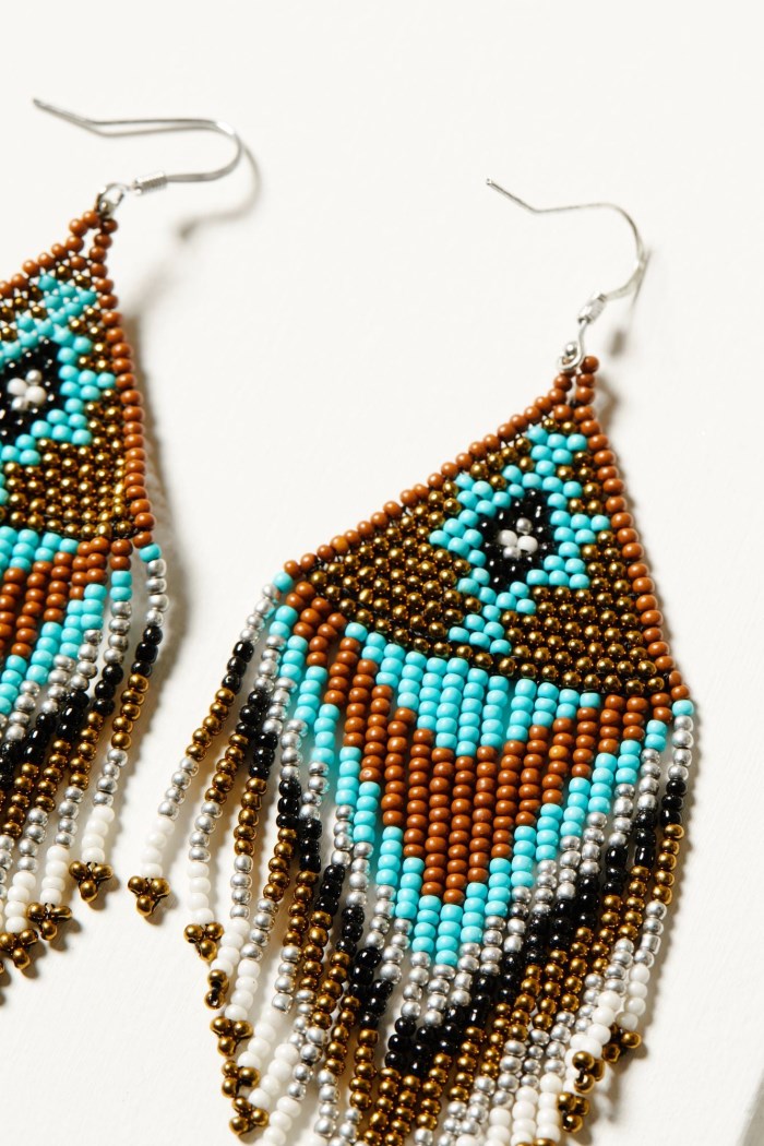 - Turquoise, brown, silver, black, white and bronze-toned beaded accent