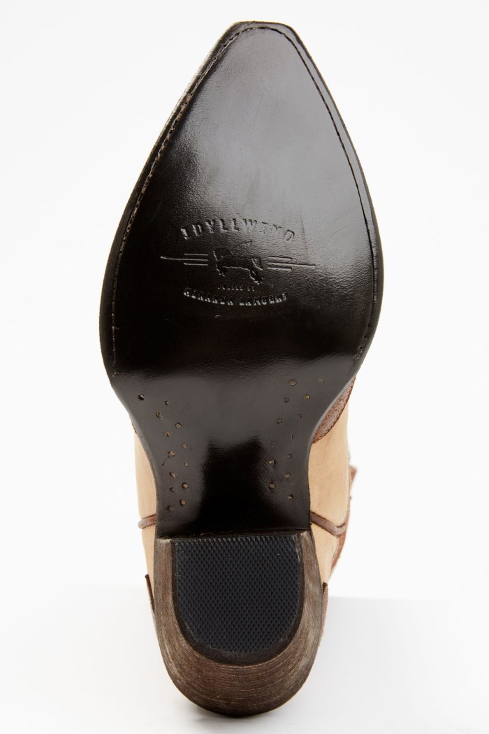 - Tan vamp with brown shaft and brown overlay design