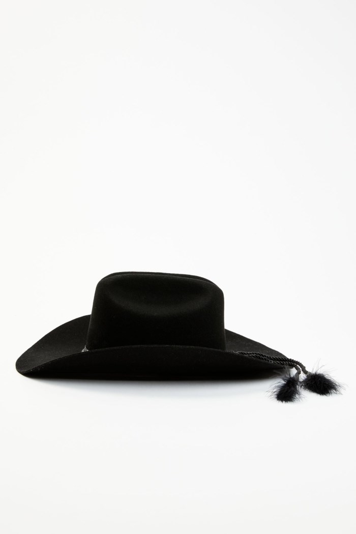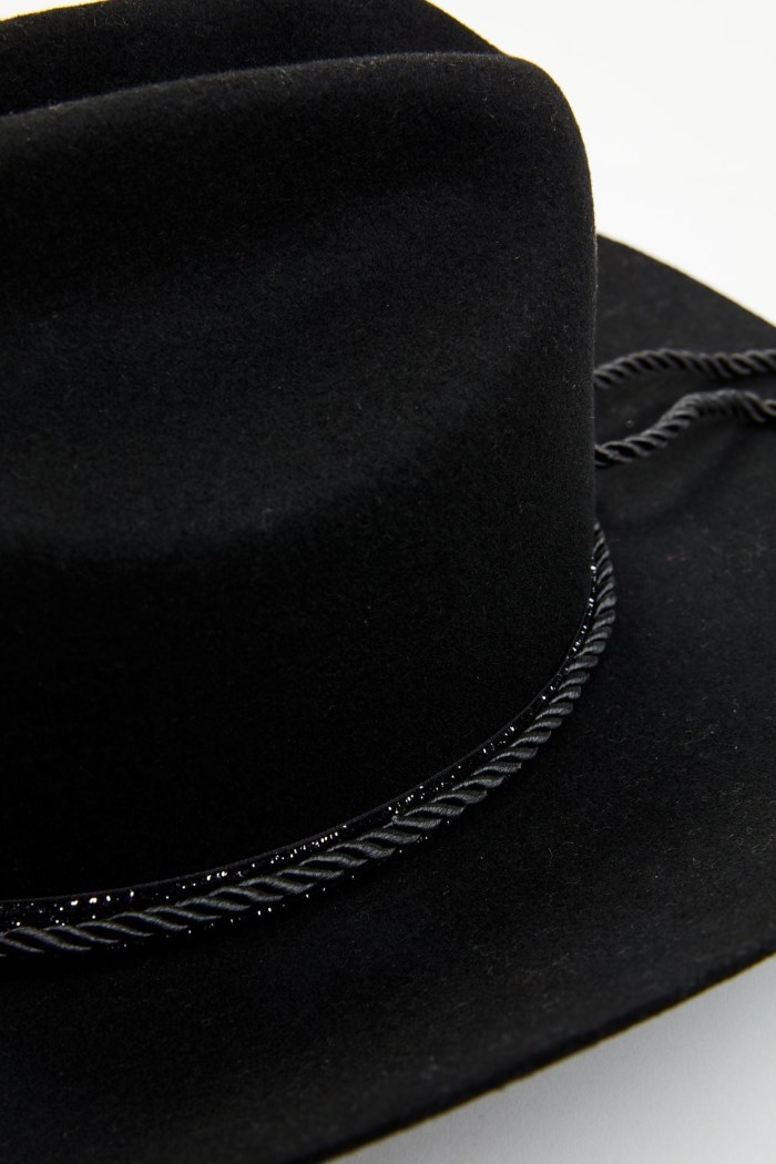 - Dual glitter velour and twisted rope hat band with feather and beaded accents