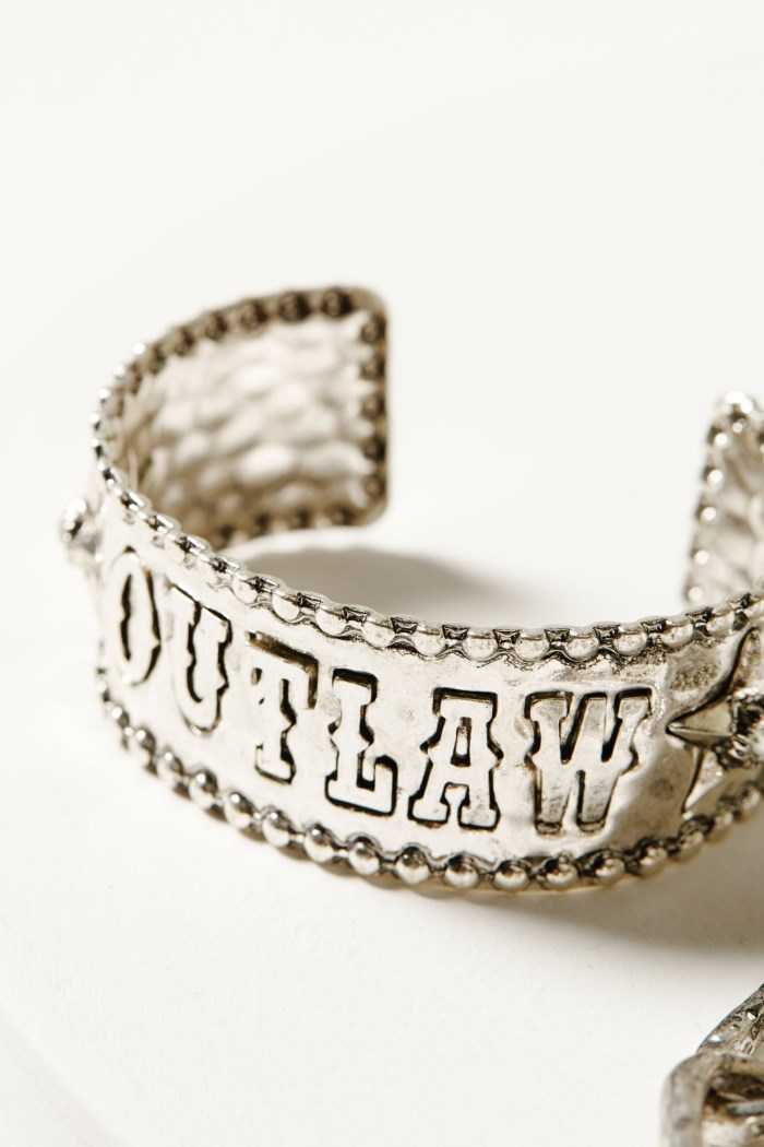 - Textured cuff bracelet with rhinestone star accents and "Outlaw"