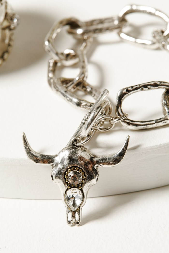 - Large chain link bracelet with rhinestone steer head pendant and toggle closure
