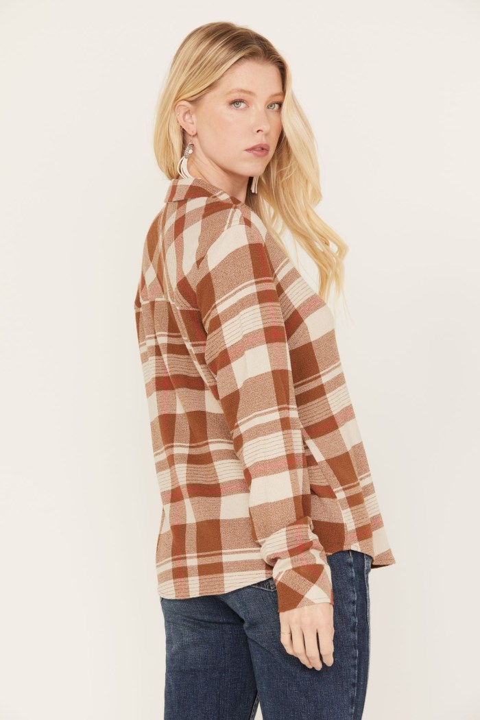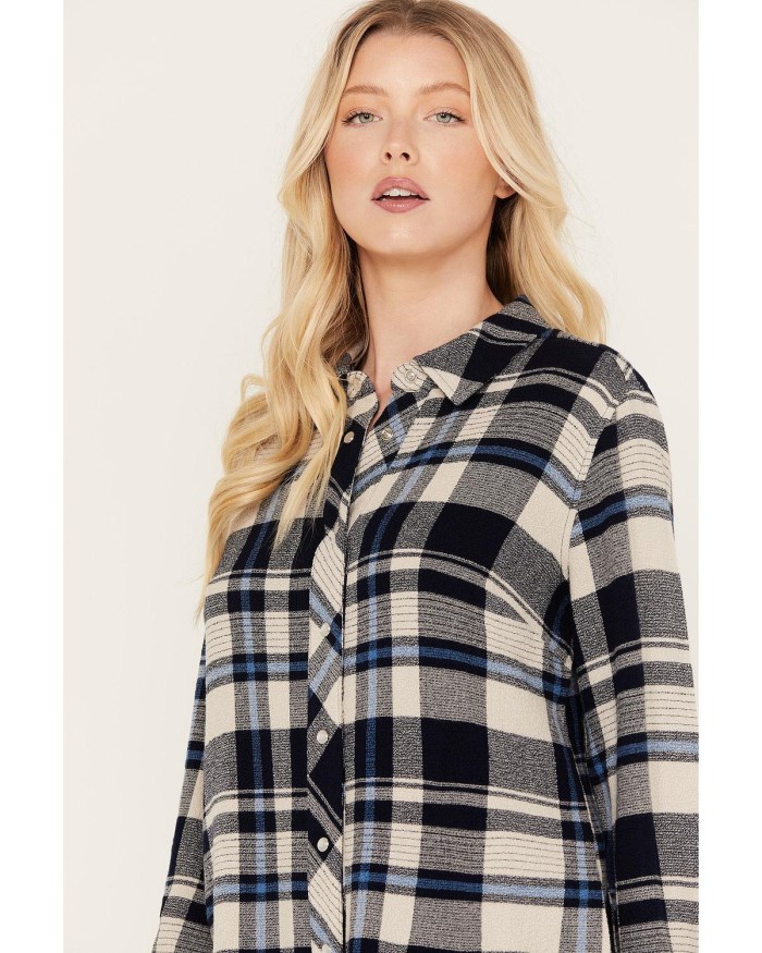 - Brown or navyplaid print pattern throughout